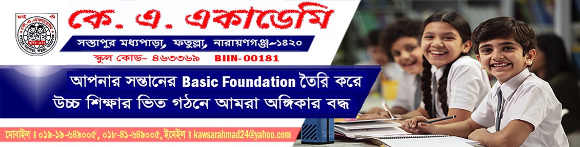 সম্মানিত অভিভাবক, আপনি কি জানেন আপনার সন্তানের উজ্জল ভবিষ্যতের পথ চলা শুরু হয় আপনার হাত ধরেই। আপনার একটি ভূল সিদ্ধান্ত তাকে পথভ্রষ্ট করে দিতে পারে, তাই আপনার সন্তানের স্কুলে যাবার বয়স হয়ে তখন আপনাকেই সঠিক সিদ্ধান্ত নিতে হবে। একটি ভালো শিক্ষাপ্রতিষ্ঠানই পারে আপনার সন্তানের উজ্জল ভবিষ্যৎতের ভিত গড়ে তুলতে। ভাল শিক্ষা প্রতিষ্ঠান বলতে বোঝায় যেখানে ভাল ফলাফলের সাথে সাথে তাকে ভাল মানুষ হিসেবে গড়ে তোলা, যার জন্য প্রয়োজন পরিকল্পিত পাঠদান ও সুশৃঙ্খল জীবন গঠন। সে লক্ষ্যে কে. এ. একাডেমির পূর্ববর্তী ফলাফল বিশ্লেষণ পূর্বক পাঠদান পদ্ধতি পর্যবেক্ষন ও পাশ্ববর্তী প্রতিষ্ঠানের সাথে তুলনামূলক পর্যালোচনা করে সঠিক সিদ্ধান্ত গ্রহণের দায়িত্ব আপনার, আপনার সন্তানের নয়।